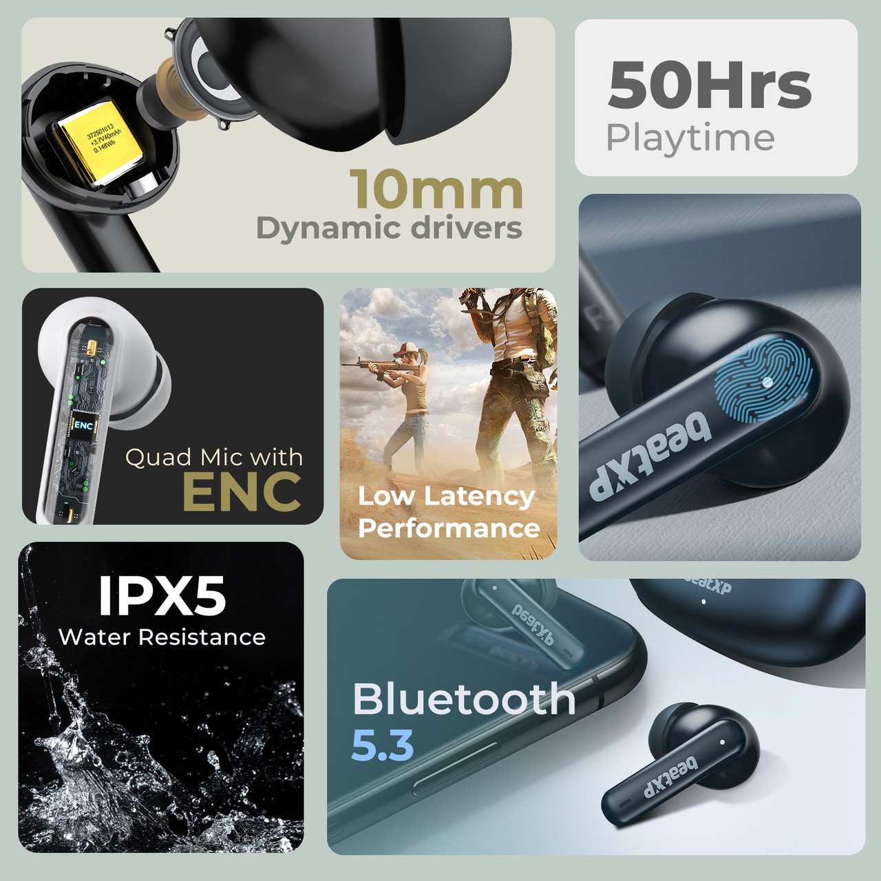 - 50 Hrs Playtime: Uninterrupted music for you throughout the day. With an enormous playtime of 50 Hrs, the Tune earpods ensure you keep your groove going for as long as you want.