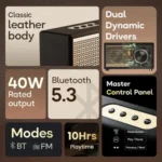 GOBOULT RetroAmp X40 delivers 40W powerful sound with dual drivers and rich stereo audio. The vintage gold leather design adds a classic look that fits any room. Bluetooth pairing stays smooth, making music, movies, and calls easy to enjoy.